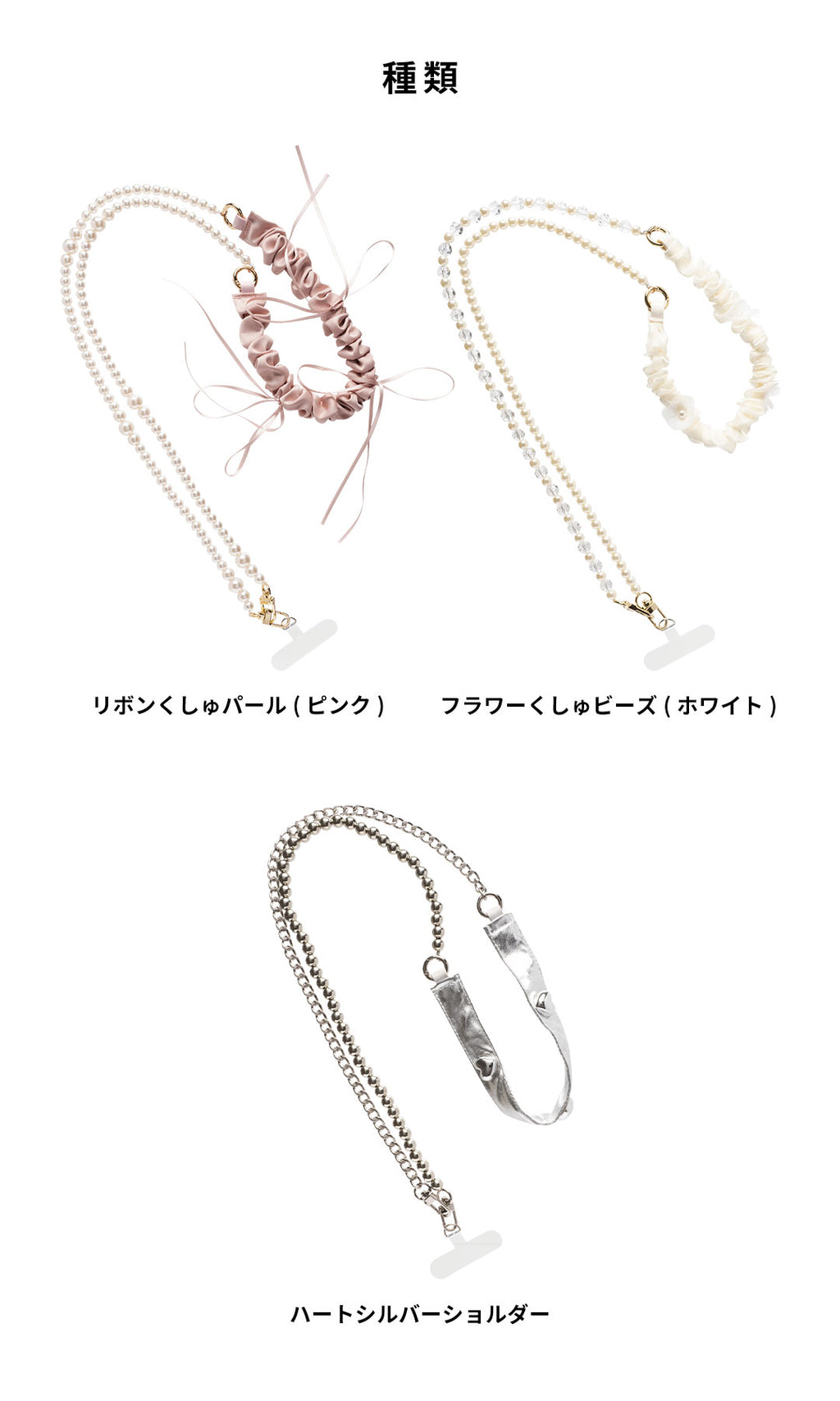 ホワイト・シルバー:ストラップ長約133~138cm(カラビナパーツ含む)、重量約74g